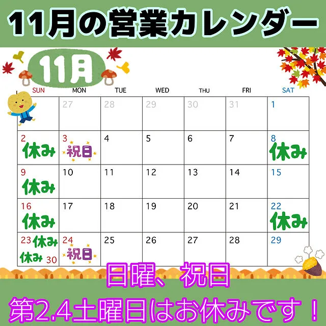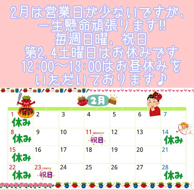 日曜・祝日・第2・第4土曜日がお休みですm(_ _)m